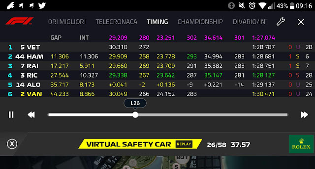 Successivamente la direzione di gara, nel giro di qualche secondo, espone prima la doppia bandiera gialla e successivamente la Virtual Safety Car. Proprio in questo frangente Hamilton è costretto a rallentare decisamente tanto da perdere ben 5 secondi in un solo settore da Vettel. Distacco cumulato che diminuisce di circa 1 secondo nel secondo settore visto che Hamilton paga 1.1 secondo. In due tratti di pista Vettel è riuscito a guadagnare circa 4 secondi da Hamilton portando il distacco oltre i 15 secondi, un gap che sotto regime di Virtual Safety Car permette al pilota della Ferrari di scavalcare Lewis Hamilton viste le basse velocità con cui procedeva lungo la pista con la propria W09.