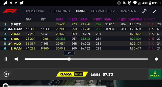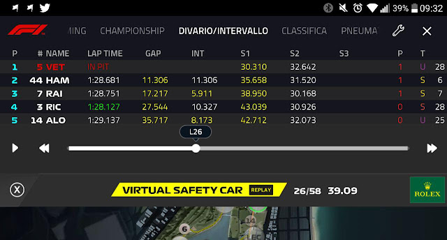 Proprio grazie a questa scelta, il pilota tedesco della Ferrari ha approfittato del regime di VSC esposto dai commissari al giro 26. Al termine del giro precedente alla sosta di Vettel, il gap che separava il pilota Ferrari da Hamilton era di 11,3 come è possibile osservare dall'immagine in basso. In questo momento la direzione gara aveva appena esposto il regime di bandiera gialla nel settore 1.
