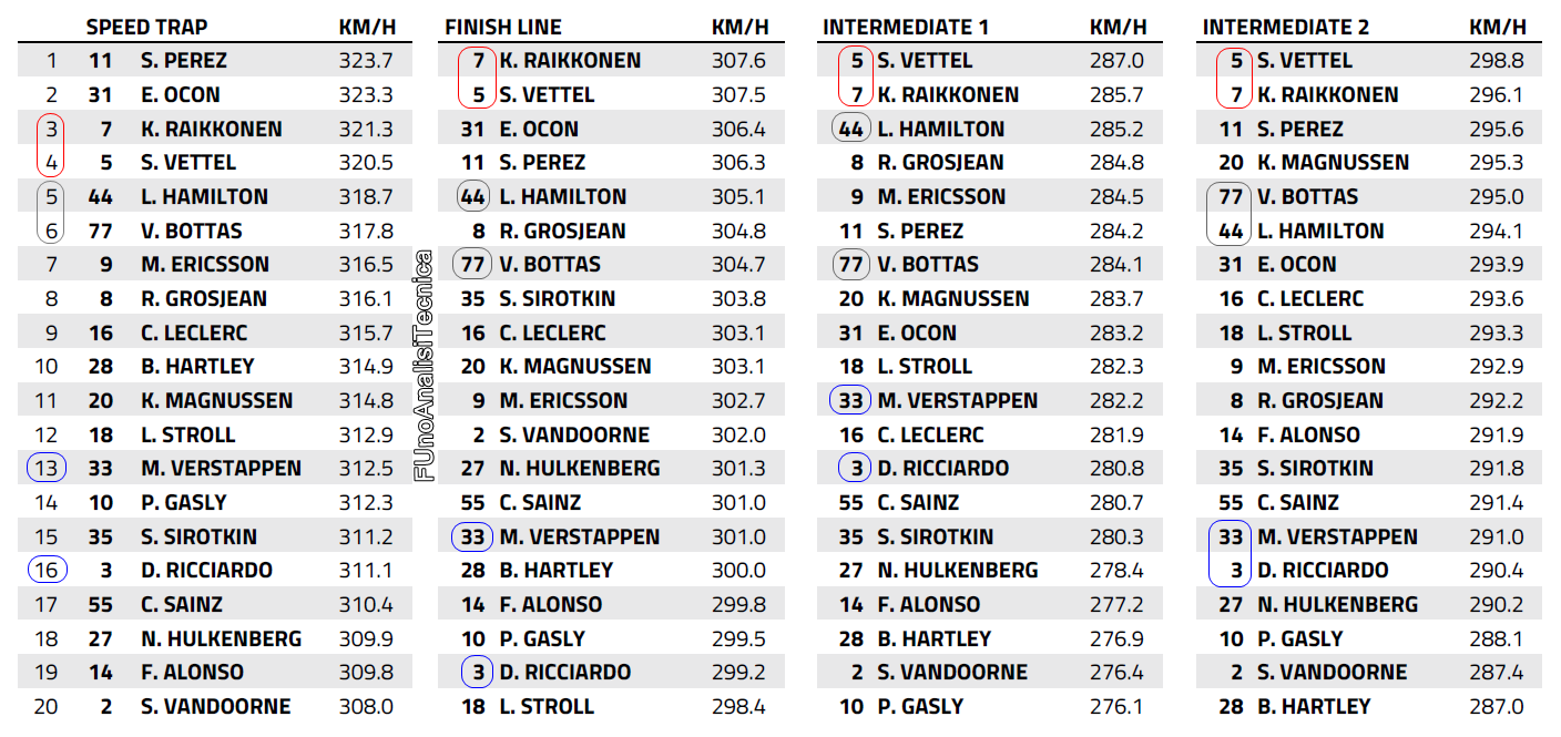 Discorso simile a quello fatto per la Mercedes W09, la RB14 vista nei test e in Australia è superiore alla Ferrari SF71H in curva ma, al contrario di quest'ultima, deve convivere con una Power Unit ancora non cosi performante come quelle utilizzate da Mercedes e Ferrari. E se sommiamo ciò all'utilizzo di ali piuttosto cariche in questo inizio di mondiale che vanno a generare importanti livelli di resistenza all'avanzamento, arriviamo a delta di velocità massime attorno ai 9 km/h rispetto a Ferrari e attorno ai 6 km/h rispetto a Mercedes. Delta velocità che ritroviamo anche nelle velocità prese negli intertempi e sulla linea del traguardo poiché sono punti dove ci si arriva dopo aver fatto della velocità in rettilineo. Detto questo, dei 7 decimi di distacco di Verstappen da Hamilton, 0.35 secondi sono stati persi nei rettilinei dell'Albert Park che diventano 0.6 secondi nei confronti di Ferrari.