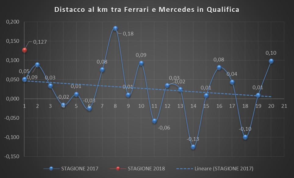 Avere una macchina ancora piuttosto "acerba" non ha permesso alla Ferrari di replicare la buona, dal punto di vista cronometrico, qualifica della scorsa stagione; come si può ben vedere dal pallino rosso del prossimo grafico, il distacco al chilometro tra la Ferrari e la Mercedes è aumentato. Importante sottolineare che un distacco di 0.127 secondi al chilometro, se lo compariamo a quanto fatto nella scorsa stagione, andrebbe a inserirsi nella penultima peggior qualifica della SF70H 2017 (migliore solo rispetto a Baku). Per essere ovviamente precisi, va anche detto che l'errore di Vettel non ha mostrato il vero potenziale della SF71H che avrebbe potuto essere idealmente staccata di a 0.090/0.100 secondi al chilometro rispetto alla W09 di Hamilton.