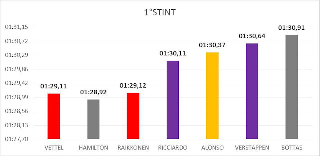 Una volta preso il comando, Sebastian Vettel, ricorrendo anche a quei chilogrammi di benzina risparmiati nel primo stint (soprattutto nei confronti del proprio compagno di squadra che nei 5-6 giri prima del primo Pit Stop è salito di potenza e consumi), è stato praticamente perfetto nel tenere un ritmo molto importante, ben 4 decimi più veloce di Kimi Raikkonen, portando cosi la propria SF71H al traguardo davanti a tutti.