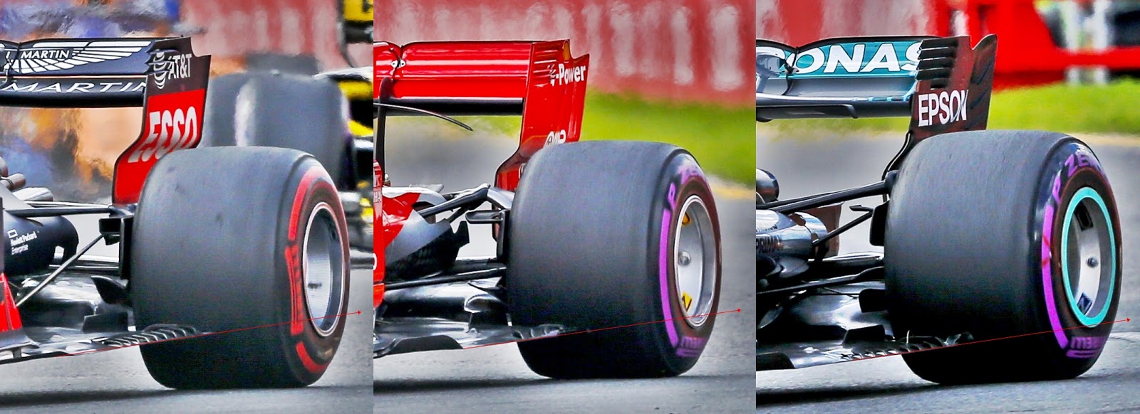 Per poter utilizzare un'ala anteriore più carica si sarebbe dovuto nuovamente caricare il posteriore con ovvie conseguenze negative sui livelli di resistenza all'avanzamento e quindi di consumo di combustibile della Power Unit italiana. Si è quindi optato per un assetto di compromesso, che non andasse a penalizzare troppo da una parte le velocità di punta e i consumi, e dell'altra la guidabilità della vettura, ossia senza eccedere nel sottosterzo sull'anteriore, sul singolo giro e soprattutto sul passo gara dando i comunque corretti kg di downforce per far lavorare correttamente le Pirelli 2018. La principale conseguenza di ciò? Una Ferrari che andava piano in curva ma molto forte sul dritto pur utilizzando un'ala posteriore da medio alto carico, questo per farvi capire come la PU italiana in versione 2018 riesce a spingere in termini di potenza massima (ancora invece piuttosto indietro sul lato efficienza rispetto alla PU Mercedes). Parlando in numeri: nel giro di qualifica, Kimi Raikkonen ha guadagnato ben 0.25 secondi sui dritti dell'Albert Park rispetto alla W09, perdendo quindi la bellezza di 9 decimi di secondo nelle 16 curve del tracciato australiano. Nei confronti di Redbull invece sono ben 6 i decimi guadagnati in rettilineo dalla SF71H ma 5 di questi recuperati dalla RB14 in curva.