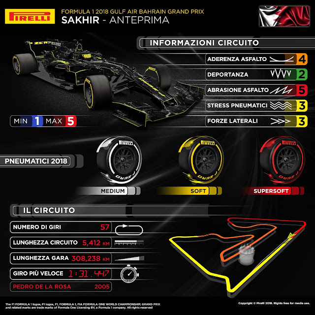 I carichi aerodinamici saranno molto simili a quelli già utilizzati in Australia e che verranno utilizzati anche nel Gran Premio in Cina della prossima settimana: tutti e tre i circuiti sono infatti tracciati da medio/alto carico aerodinamico. Quello a Sakhir (periferia di Manama) è un tracciato disegnato da Hermann Tilke come quello in Cina, ma la presenza di numerose curve strette lo rende più simile a quello di Melbourne come caratteristiche di stop&go (accelerazione da marce basse) che portano a privilegiare le qualità di trazione delle monoposto, e di conseguenza a sforzare soprattutto le gomme posteriori. Anche il consumo di carburante ne risentirà, come pure quello dei freni date le numerose staccate. Un dato piuttosto importante, messo molto in risalto nelle analisi post Gp d'Australia, è il "delta passo" per effettuare un sorpasso che in Bahrain sarà di solo 1 secondo contro 1.6 sec dell'Australia. Se associamo ciò al fatto che la FIA ha deciso di "allungare" la zona DRS sul rettilineo del traguardo di ben 100 msi può capire come potremo sicuramente vedere nella gara di domenica un numero maggiore di sorpassi rispetto alla gara inaugurale di questo mondiale 2018 di F1.