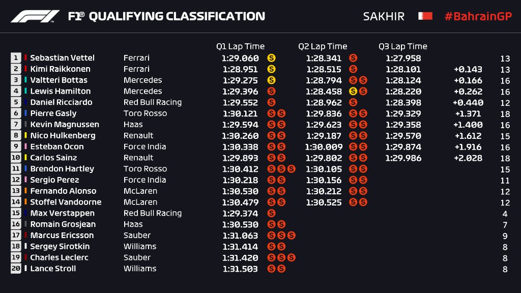 Le qualifiche del Gp del Bahrain ci hanno regalato una prima fila tutta Rossa con Vettel che è riuscito a sopravanzare Raikkonen solo nell'ultimo dei suoi giri disponibili. Raikkonen, nel suo ultimo tentativo, è stato rallentato dal traffico che non gli ha permesso di esprimere il massimo potenziale della vettura. Vettel, invece, nel suo primo tentativo ha commesso un errore nell'ultima curva che non gli ha permesso di ottenere la prima posizione. Prima posizione che è stata ottenuta sfruttando al massimo il suo secondo tentativo.