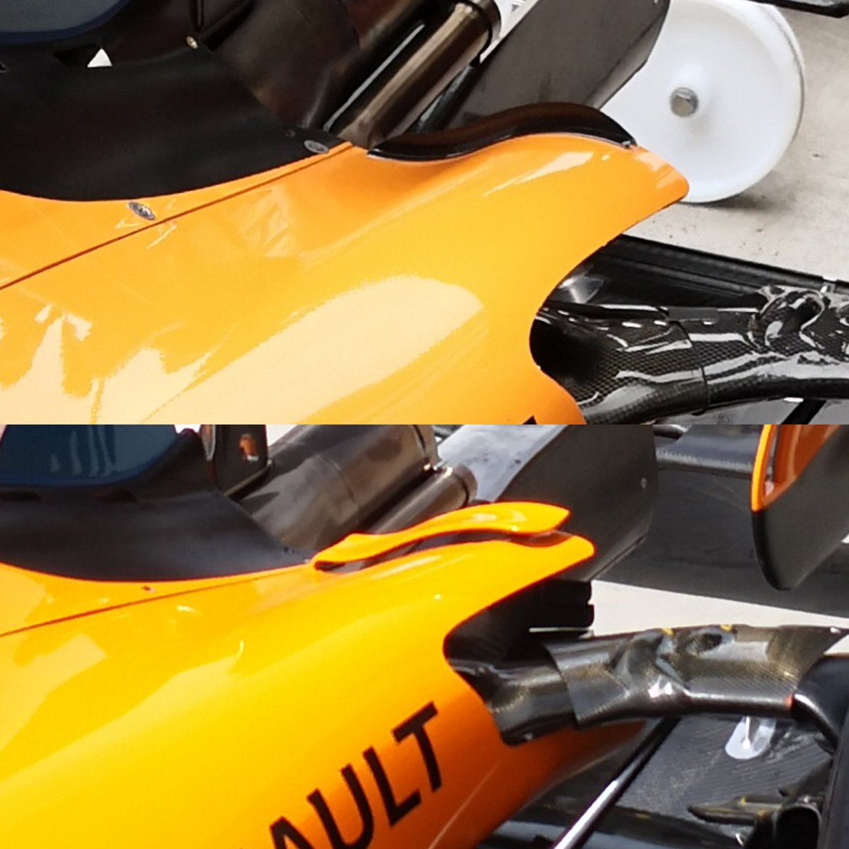 La Mclaren, fin dalla presentazione, aveva sorpreso per le lunghissime soffiature che erano state collocate sul fondo. Soffiature che, come potete osservare dall'immagine in basso, sono state modificate. Dalle foto si vede l'apposito fissaggio che viene introdotto per evitare un'eccessiva flessione. Tale soluzione non sarebbe considerate "legale" se gli slot fossero completamente aperti, come lo era quello montato all'inizio della scorsa stagione sulla SF70H e poi "bannato" dalla Fia dal Gran Premio d'Austria.