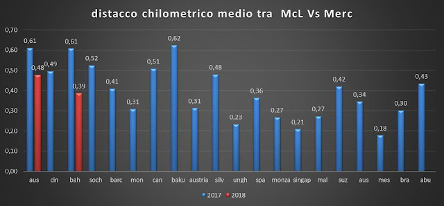 Se analizziamo il grafico in basso che mette a confronto il distacco chilometrico rispetto alla Mercedes possiamo notare che un piccolo miglioramento c'è stato. Nella passata stagione in Australia e in Bahrain la McLaren aveva rimediato un gap medio al chilometro di 0,55s. In questo 2018, questo distacco, è sceso a 0,43 s al chilometro. Il guadagno prestazionale avvenuto tra il 2018 e il 2017 è quantificabile in 0,12 al chilometro che equivalgono a circa 6 decimi al giro su una pista di lunghezza di 5 km.