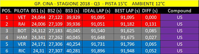 Andando ad analizzare i Best Sectors dei due piloti della Ferrari possiamo notare che Vettel è riuscito a fare la differenza rispetto a Raikkonen nel settore conclusivo della pista (anche a causa di un assetto leggermente più scarico che potrebbe aiutarlo in gara) mentre, nei primi due tratti, il pilota finlandese era stato leggermente più veloce. Sommando i tre BS possiamo notare come Raikkonen aveva sicuramente nel piede la pole position "ideale" ma non è riuscito a mettere insieme i propri migliori settori in un unico giro. La grande forza di Vettel, soprattutto nei confronti del compagno di squadra finlandese, è anche questa: trovare il giro giusto nel momento giusto.