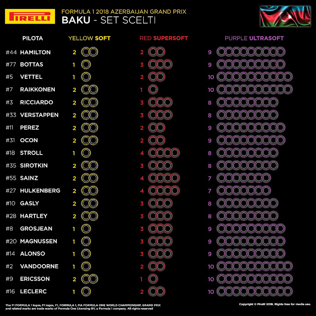 Da segnalare come RedBull abbia optato per una scelta più conservativa portando a Baku ben due set di pneumatici Soft, tre di SuperSoft e soli otto treni di UltraSoft.