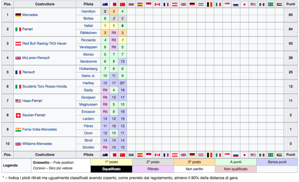 "Gara costellata di colpi di scena vinta da Ricciardo su Red Bull che precede Bottas e un fantastico Stroll. Seguono quindi la Ferrari di Vettel e la Mercedes di Hamilton, autori di scaramucce in pista quasi fossero due “automobilisti della domenica”. Verstappen è costretto al ritiro così come Raikkonen. Al via partono tutti bene davanti; in curva 2 un arrembante Raikkonen si trova in seconda posizione, ma Bottas lo attacca molto deciso, salta sul cordolo e perde il controllo della vettura che va quindi a toccare la rossa del finlandese che a sua volta tocca il muro. La peggio va a Bottas, però, che si ritrova con l’ala anteriore danneggiata e una gomma forata. Gara che sembra totalmente compromessa quando rientra in pista doppiato. Il tutto favorisce Vettel che si mette in marcatura di Hamilton e i due scappano via insieme, inseguiti da Perez e da Verstappen. Quest’ultimo, proprio mentre cerca l’attacco sul messicano, è costretto al ritiro per problemi tecnici.