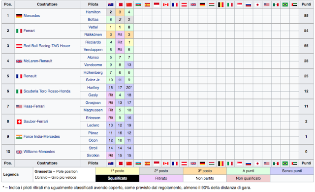 Arriviamo al giro 14, quando le cose iniziano a farsi complicate: Kvyat si ferma in pista e i commissari non riescono a rimuovere subito la sua macchina. Safety car e tutti ai box per cambiare le gomme. Trascorre qualche giro e c’è la ripartenza, ma dopo poche curve ecco di nuovo in pista la vettura di sicurezza. Raikkonen ha perso dei pezzi dal fondo parecchio danneggiato dal contatto al via con Bottas. Qui succede anche il fatto che farà discutere molto: poco prima della nuova ripartenza, Hamilton rallenta parecchio, forse troppo. Vettel lo tampona da dietro, danneggiando l’ala anteriore, ma l’episodio più importante è che subito dopo il tedesco si affianca alla Mercedes e imprecando verso Hamilton finisce anche per colpirlo ruota contro ruota. Nasce quindi l’investigazione che porterà ad una penalità di 10 secondi stop/go per Vettel. Si riparte, ma anche stavolta subito dopo curva 2 c’è un incidente: Ocon tenta il sorpasso sul suo compagno di squadra, ma lo chiude troppo e Perez finisce a muro. Volano detriti ovunque e Raikkonen non li può evitare. Foratura per lui e fondo danneggiato anche dall'altro lato. Sia Perez che Raikkonen devono ritirarsi. Altra Safety Car, ma i detriti sono troppi e ovunque. Si decide quindi per fermare la gara con bandiera rossa. Circa mezzora di stop e si può ripartire. I colpi di scena non sono finiti però: dopo qualche giro ecco che Hamilton ha un problema. La protezione della testa non è ben fissata e si alza! L‘inglese prova a fissarla, ma non riesce. E’ costretto così ad un’ulteriore sosta ai box. Vettel fa quindi due giri da qualifica prima di rientrare per la penalità e al ritorno in pista riesce a stargli davanti."