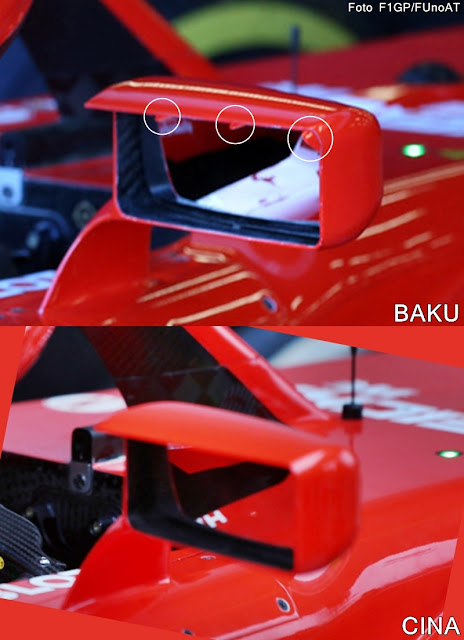Ricordiamo che la Ferrari è l'unico Team ad avere studiato degli specchietti con una funzione prettamente aerodinamica per evitare che la loro turbolenza influenzi gli elementi che stanno in una posizione più arretrata. La seconda importante funzione che svolgono è quella di "schiacciare" il flusso passante nella parte alta e all''interno degli specchietti sulla pance, portando quindi più aria nella parte alta del diffusore e nella parte bassa dell'ala posteriore.