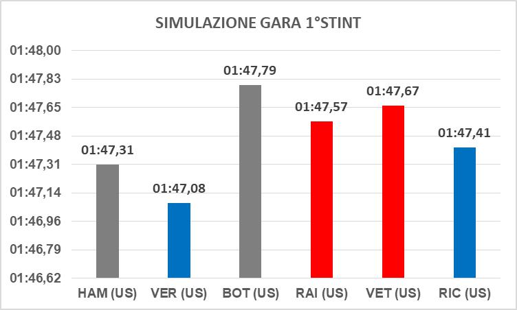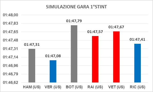 Se analizziamo le simulazione di gara possiamo notare, nuovamente, che la Red Bull è stata la vettura più veloce in pista con Verstappen che è riuscito ad avere un passo migliore di 3 decimi rispetto a quello di Ricciardo.