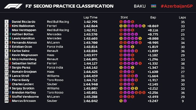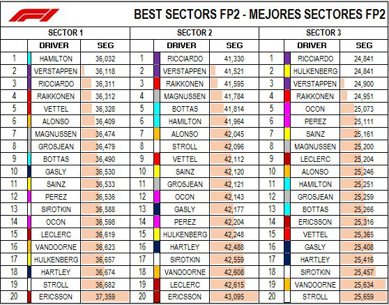 Analizzando la tabella in basso si possono riscontrare due dettagli molto importanti. Uno lo abbiamo già annunciato nell'introduzione a questo post ed è il fattore potenza della Power Unit che è analizzabile osservando i dati del settore 3 che è composto da un lungo rettilineo. In questo tratto di pista i motorizzati Renault sono risultati i più veloci mentre Vettel, Hamilton e Bottas li troviamo nelle retrovie. Solo Raikkonen è presente nelle prime posizioni grazie alla scia di Hamilton che il pilota finlandese ha potuto sfruttare nel suo giro veloce. Questo ci dimostra che, Ferrari e Mercedes, hanno disputato queste prove libere 2 con mappature del motore "da crociera".