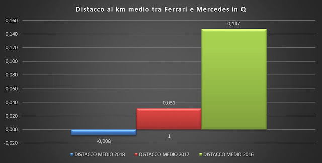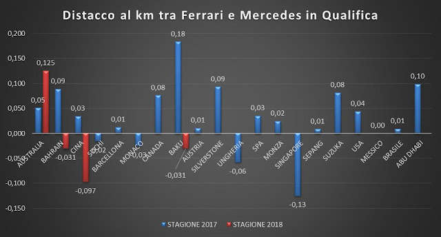 Ferrari che, rispetto alla stagione scorsa, è riuscita a recuperare sulla Mercedes circa 2 decimi come dimostra il grafico in basso che mette in risalto il distacco chilometrico tra i due Team.