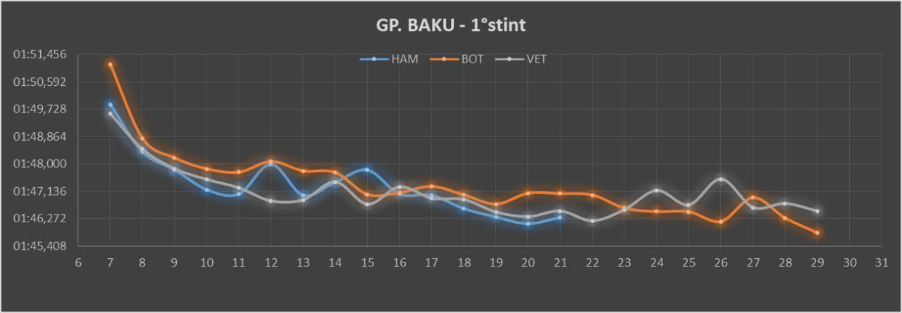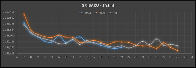 La Mercedes a differenza della Ferrari deve risolvere un problema chiamato pneumatici. Ad eccezione del fine settimana in Australia gli ingegneri anglo-tedeschi hanno avuto dei problemi con la corretta gestione delle gomme visto che faticano a mantenere la giusta finestra di funzionamento. Nelle giornate fresche gli pneumatici non entrano in temperatura mentre, quando le temperature si alzano, soffrono di surriscaldamento specialmente nelle posteriori. Qui a Baku si sapeva che il reale problema di questa pista era quello di avere nel giusto range di funzionamento sia l'assale anteriore che quello posteriore visto che, specialmente all'avantreno, le gomme, nel lungo rettilineo andavano a perdere più di 30°C mettendo in crisi la vettura nella prima frenata e nelle curve successive.