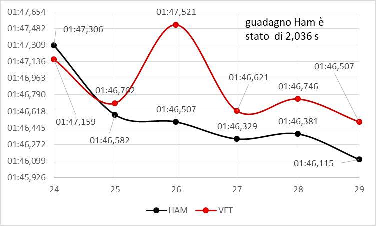 Hamilton, come potete osservare dal grafico 1 è stato molto altalenante nei tempiintervallando giri veloci a giri meno rapidi. Il grosso handicap per la Mercedes è stato il secondo settore, il più guidato dove, se escludiamo rare accezioni, la Ferrari è sempre stata molto più veloce. Tempo perso nel secondo settore che veniva, in parte, recuperato nel settore 3 caratterizzato da un rettifilo di oltre 2 chilometri.