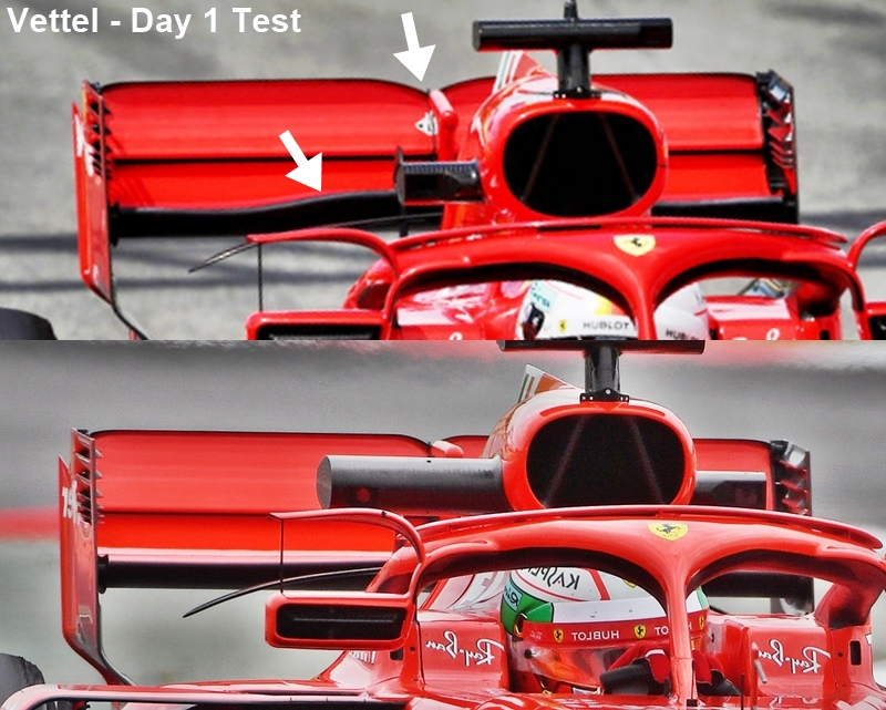 Partendo dal Team italiano, che in questi test si è concentrato principalmente sul risolvere i problemi di grip riscontrati nello scorso fine settimana, si può vedere dalla foto confronto in alto come nella giornata di ieri Sebastian Vettel abbia portato in pista una nuova specifica di ala posteriore. Un test che è durato solamente un run e molto probabilmente era più orientato al preparare il Gran Premio di Monaco, se i risultati sono stati promettenti, visto la specifica da maggior carico.
