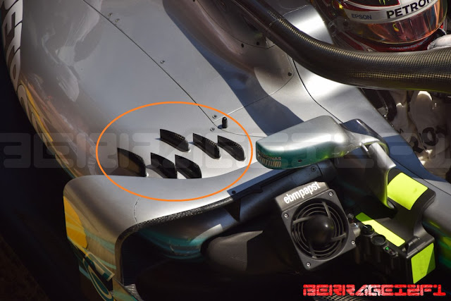 Per quanto riguarda Mercedes invece, fin dalla mattinata di ieri sono comparsi sulla parte centrale della W09 dei deviatori di flusso in stile McLaren, mantenuti poi per tutta la giornata di ieri e quella odierna. Da segnalare che nella mattinata di oggi, Valtteri Bottas ha raccolto dati per il Gran Premio del Canada, montando al posteriore un'ala a cucchiaio da medio basso carico. Dopo pochissimi giri in quella veste aerodinamica e con i rastrelli di raccolta dati, sulla W09 è tornata l'ala posteriore da maggior carico utilizzata durante il fine settimana scorso.