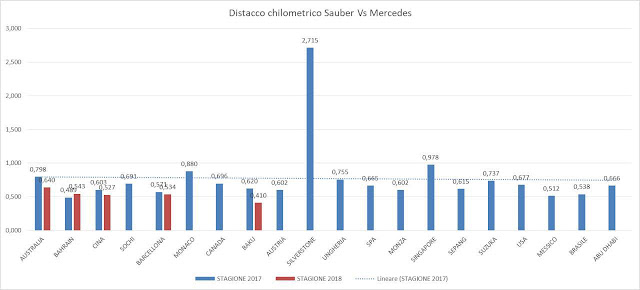 Se la classifica costruttori "sorride" lo stesso si può dire delle prestazioni della C37 che, analizzando il distacco chilometrico da Mercedes, è il team che, rispetto allo scorso anno, è riuscito a recuperare il maggior gap. Come dimostrano i grafici in basso si è passati da un distacco chilometrico di 0,770 s del 2017 a "soli" 0,531 s del 2018. Questo sta a significare che, il team elvetico, è riuscito a recuperare su Mercedes ben 240 millesimi a chilometro che, su un tracciato di 5 chilometri, equivalgono a ben 1,199 s al giro.