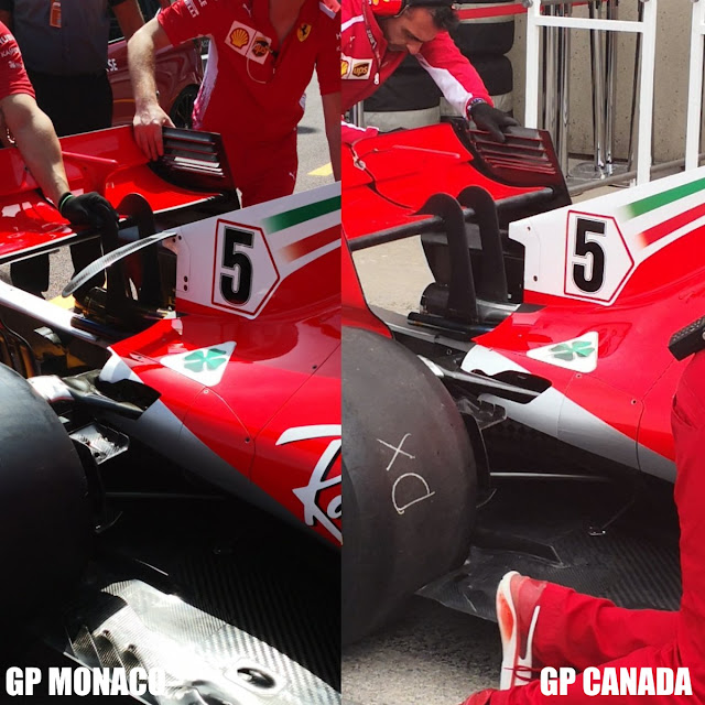 Dalle foto che arrivano direttamente dai box del circuito di Montreal si nota la mancanza della Deck Wing mentre non è ancora presente sul posteriore della SF71H l'ala a cucchiaio che la Ferrari aveva utilizzato su altri circuiti da medio carico. Ala che potrebbe essere montata nel corso della giornata prima di portare la vettura alle verifiche tecniche.