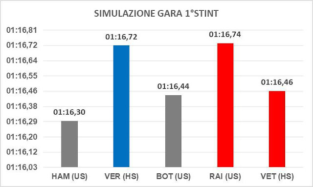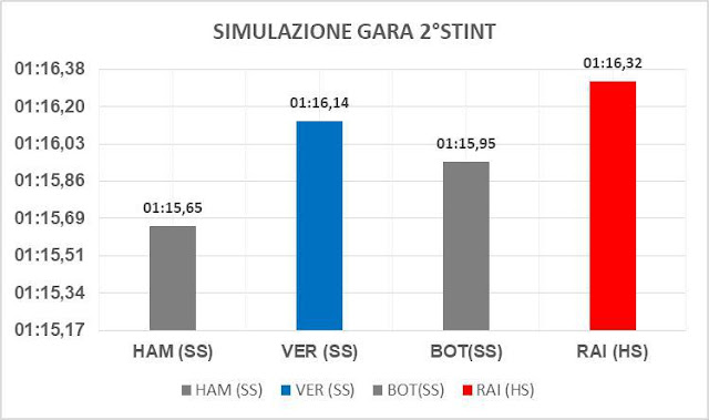 Se andiamo ad analizzare i passi gara delle simulazioni effettuate dai vari piloti a fine sessione pomeridiana, possiamo notare che, i due alfieri della Mercedes sono stati i più veloci realizzando stint anche piuttosto lunghi: 14 giri per Hamilton e 12 per Bottas. Vettel invece, sfruttando le gomme più prestazionali, ha realizzato uno stint piuttosto corto pur girando con un ritmo similare a Hamilton e Bottas. Più lenti di 4 decimi sono stati invece Max Verstappen (HyperSoft) con la sua RedBull RB14 e Kimi Raikkonen (UltraSoft) su Ferrari. Verstappen, nonostante sul ritmo gara non sia riuscito ad essere veloce quanto le Mercedes, è sembrato essere piuttosto soddisfatto.