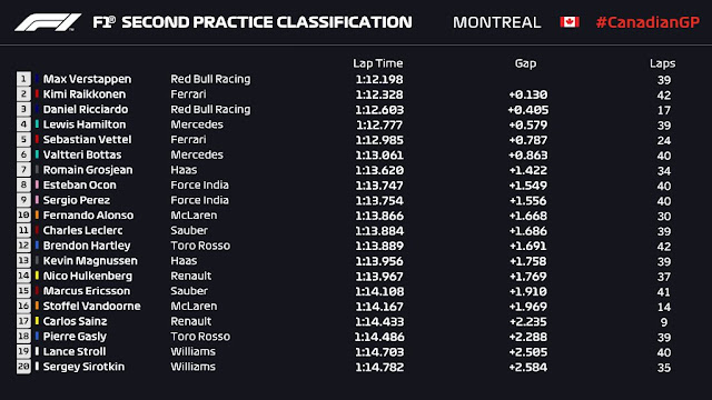 Cosi come nella prima ora e mezza di prove libere, anche in quelle pomeridiane il pilota più veloce è stato Max Verstappen che, sfruttando gli pneumatici HyperSoft, è riuscito a precedere di circa 1 decimo la Ferrari di Kimi Raikkonen. Al terzo posto Daniel Ricciardo che, negli ultimi minuti delle libere, è riuscito a portarsi nelle posizioni di testa sfruttando sempre gli pneumatici più morbidi portati in Canada dalla Pirelli. Quarta posizione per la Mercedes di Lewis Hamilton che ha ottenuto il suo best time con le gomme SuperSoft, la più dura delle tre. In generale, la Mercedes del campione del mondo è la vettura che ha destato le migliori impressioni sia nelle simulazioni di qualifica (da valutare come Mercedes riuscirà a sfruttare però il compound HyperSoft) che soprattutto in quella di gara.