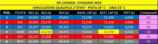 Il quattro volte campione del mondo è riuscito a migliorare il proprio Best Sector 1 e 3 ma non il 2 e questo gli ha compromesso il tempo sul giro. Una Mercedes che ha optato per girare molto ma con una mappatura ancor più "tranquilla" rispetto al solito. Una scelta che è da associare all'alto chilometraggio di tutte le componenti che stanno utilizzando sia Hamilton che Bottas. C'è comunque da sottolineare che queste Power Unit ibride moderne soffrono molto meno la distanza rispetto ai vecchi aspirati tant'è che parlando lo scorso anno in Austria con un motorista del circus ci disse che un motore endotermico a fine vita perde circa l'1% della sua potenza (8 CV, 1 decimo e mezzo in Canada). Molto interessante la prestazione di Kimi Raikkonen che nel giro di qualifica ha fatto segnare un crono (ipotetico, a CV "sbloccati") migliore di quello di Max Verstappen. Ed è questo che lascia molto positivo un Sebastian Vettel invece un po attardato e sottotono (poi spiegheremo il perchè).
