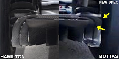 Come potete osservare dall'immagine in basso sono state introdotte delle modifiche nella zona dei bargeboards evidenziate con la freccia verde e quella rossa. Per comprendere l'effetto cercato dagli aerodinamici con questi piccoli interventi bisogna comprendere la funzione che tutti questi profili ricoprono in una vettura di Formula 1. I bargeboards sono semplicemente dei deviatori di flusso posti dietro le ruote anteriori, in corrispondenza delle prese d’ingresso dell'aria di raffreddamento dei radiatori. Questi particolari aerodinamici svolgono molteplici funzioni quali separare, canalizzare e indirizzare i flussi provenienti dall'ala anteriore verso il fondo, le prese d’aria radiatori e l’esterno delle fiancate. I bargeboards vengono utilizzati per guidare l'aria turbolenta dalla scia dell'ala anteriore, lontano dal flusso d'aria vitale sotto la vettura. Il bordo inferiore e posteriore di un bargeboard crea un vortice che viaggia lungo il bordo inferiore esterno del sidepod, agendo come un a vera e propria diga che permette di sigillare il più possibile il fondo piatto . In queste vetture moderne, inoltre, vengono sfruttati come dei veri e propri generatori di vortice per garantire il miglioramento del flusso diretto verso il fondo vettura con conseguente aumento del carico aerodinamico.
