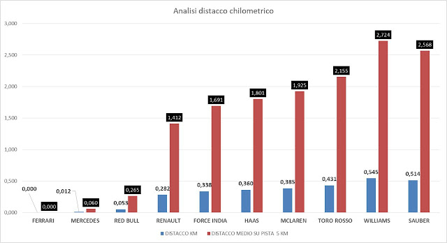 Forza della Ferrari che si può vedere anche dal grafico in basso deve vengono messi in evidenza i distacchi chilometrici e il relativo gap su un circuito di 5 km di lunghezza. Dal grafico si evince che, la SF71H, fino ad ora, è la miglior monoposto seguita a 60 centesimi dalla Mercedes e a165 millesimi dalla Red Bull. Tra le vetture di centro classifica primeggia la Renault seguita da Force India, Haas e McLaren. In coda troviamo la Williams che si è fatta scavalcare dalla Sauber e dalla Toro Rosso.