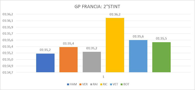 Se analizziamo il passo del 1°stint possiamo notare la netta superiorità di Hamilton sulla RedBull nonostante che il pilota inglese abbia pensato soprattutto a gestire più che a spingere sull'acceleratore. Le due RedBull e Raikkonen hanno girato sullo stesso ritmo mentre Vettel e Bottas, impegnati a rimontare con una gomma meno prestazionale, la Soft, hanno avuto un ritmo superiore a quello di Hamilton.