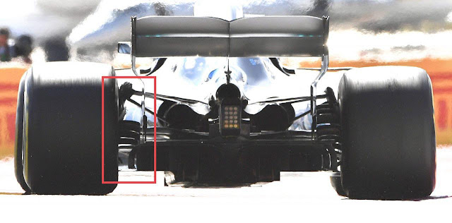 Se Vettel ha rimontato agevolmente la stessa cosa non si può dire per Bottas che nel contatto e nella successiva foratura ha danneggiato piuttosto pesante il diffusore nella zona esterna. Come potete osservare nell'immagine in basso, sulla vettura di Bottas sono stati danneggiati i profili ad arco che hanno la funzione di ripulire le turbolenze generate dalla rotazione delle gomme oltre che parte della sospensione posteriore e i deviatori posizionati dietro le prese d'aria dei freni posteriori. Danni piuttosto importanti che la Mercedes ha quantificato in circa 2 decimi al giro e che hanno creato grossi problemi di bilanciamento sulla vettura del finlandese.