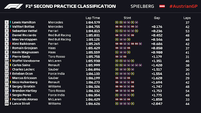 Passando a Ferrari, Sebastian Vettel è convinto che la giornata odierna è da considerarsi piuttosto positiva. Il pilota tedesco ha concluso la seconda sessione in terza posizione a poco più di due decimi di secondo da Lewis Hamilton ma non ha manifestato nervosismo ed anzi, nelle dichiarazioni post libere pomeridiane ha messo in evidenza il possibile grande passo in avanti a cui la Ferrari ci ha abituati tra il venerdì e i sabato di gara. Le SF71H viste oggi in pista hanno mostrato, seppur in modo meno accentuato, i problemi di sottosterzo visti in Canada e in Francia. Un sottosterzo deleterio che non permette il pieno sfruttamento degli pneumatici a serbatoio vuoto (leggersi simulazione di qualifica). Ferrari perde molto da entrambe le W09 nelle curve di medio alta velocità come la 7 e la 9, mentre riesce ad essere molto performante in uscita da curva 3 e nel tratto che porta a curva 4. Se l'Ideal Lap vede Hamilton davanti di circa 3 decimi al tedesco della Ferrari, due di questi tre decimi sono infatti accumulati nell'ultimo, corto, settore della pista austriaca (1%). Sarà proprio qui dove Sebastian Vettel e i suoi ingegneri dovranno migliorare molto dalla giornata odierna a quella di domani.