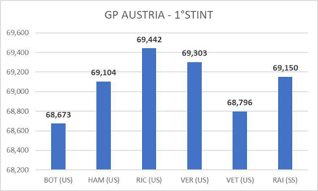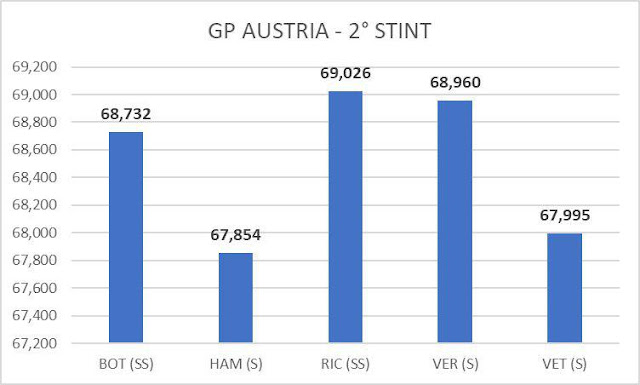 Interessante notare che nella giornata odierna i gap tra le tre mescole, UltraSoft, SuperSoft e Soft, portate in Austria dalla Pirelli erano molto ridotti, quasi nulli, con la più morbida delle tre (la UltraSoft) che ha dato parecchi problemi di sfruttamento a tutti i sei Top Driver. Quanto scritto è ben chiaro nella tabella postata sopra dove con le celle gialle siamo andati a indicare i Best Sectors fatti segnare con una mescola differente dalla "morbidissima" UltraSoft. Prendendo come esempio le W09, con la "viola" sono diventate tutte d'un tratto molto sottosterzanti pagando dazio nell'ultimo settore, composto da curve dove la precisione dell'anteriore è fondamentale per fare il tempo. Secondo Pirelli nella giornata di domani, grazie all'evoluzione della pista, i gap tra le tre mescole dovrebbero comunque aumentare.