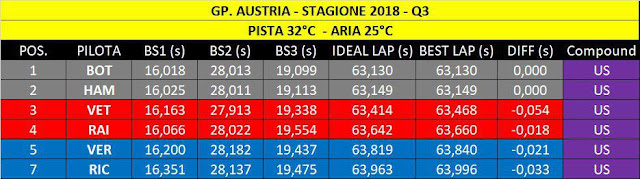 Proprio come lo scorso campionato, Valtteri Bottas ha conquistato la pole position del Gran Premio d'Austria a Spielberg. Dietro al pilota finlandese un Lewis Hamilton a soli 0,019 secondi e un Sebastian Vettel staccato di ben 0.334 secondi. Seconda prima fila tutta Mercedes nell'arco di una settimana, ma quella odierna ben più importante visto l'utilizzo delle Pirelli "standard" e non dei più favorevoli pneumatici ribassati che torneranno la prossima settimana in quel di Silverstone.