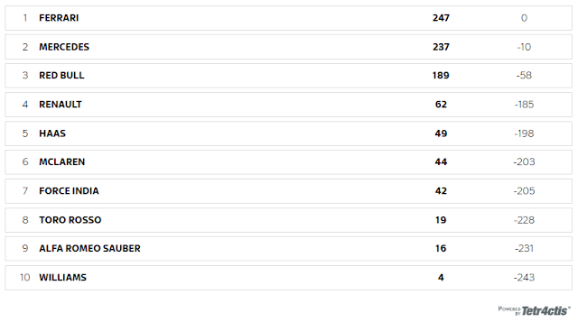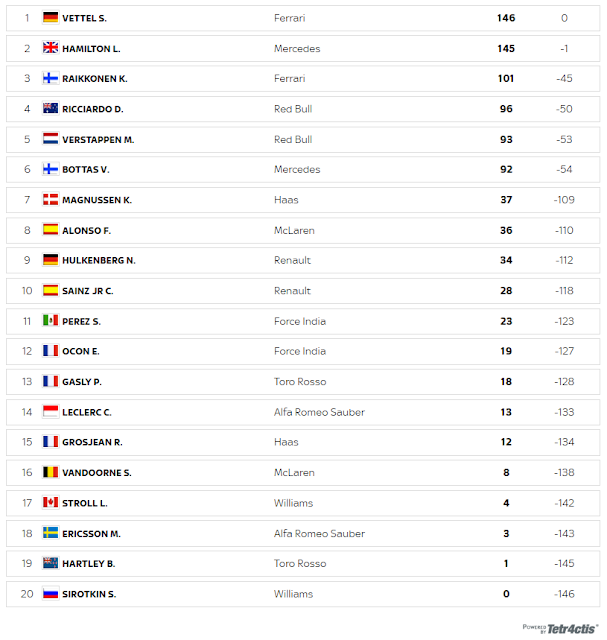 Concludiamo, con un plauso a Ferrari per non aver impartito ordini di scuderia ai suoi due piloti dopo una gara piuttosto positiva di Kimi Raikkonen, e facendo i complimenti al sempre giovane Fernando Alonso che sta tenendo in piedi da solo una McLaren veramente in crisi di risultati. Nota curiosa: il pilota spagnolo ha centrato l'ottava posizione partendo dalla Pit Lane utilizzando una specifica 2017 di ala anteriore poiché quelle dell'anno in corso sono state tutte danneggiate durante il fine settimana austriaco.