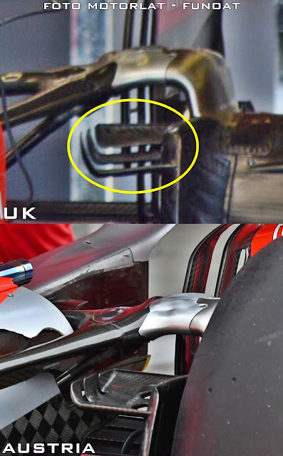 L'area che è stata aggiornata in questo decimo appuntamento della stagione è una di quelle dove si erano già viste novità al Montmelo; stiamo parlando delle appendici aerodinamiche posizionate nella parte interna degli pneumatici posteriori e che sono importanti per condizionare il flusso in arrivo sull'attacco della sospensione e sull'endplate dell'ala posteriore. Come si può ben vedere dall'immagine confronto in alto, sono infatti state completamente aperte le due soffiature.