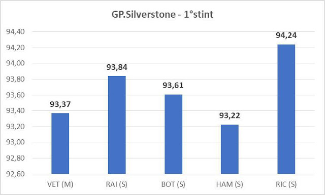 Se analizziamo l’andamento dei giri dei vari piloti possiamo notare che le alte temperature non hanno messo in difficoltà in modo importante le gomme anche se i tempi si sono alzati giro dopo giro. Il tempo di attacco migliore è stato quello di Vettel, pur sul compound Medium, ma chi ha avuto la media cronometrica migliore (vedi grafico in basso) è Lewis Hamilton che è sembrato il pilota più soddisfatto del compound Soft con il pieno benzina. Sullo stesso compound ha rifilato 4 decimi al compagno di squadra e ben 6 decimi a Kimi Raikkonen che ha però trovato un po di traffico sul suo stint. Per quanto riguarda RedBull, l'assetto molto scarico utilizzato sulla RB14 di Daniel Ricciardo non ha pagato. Sarebbe stato molto utile per il team anglo austriaco avere anche i dati di Verstappen, sceso in pista nella giornata odierna con un assetto ben più carico (viceversa al RedBull Ring). A fine giornata Marko è piuttosto chiaro: "Siamo lenti su tutti i tipi di pneumatici. Un ritmo addirittura più lento che in Austria . Deve esserci qualcosa nel setup che è sbagliato. Perdiamo molto tempo negli angoli. Temo che abbiamo bisogno di cambiamenti di setup più importanti rispetto a Spielberg".