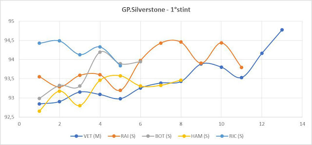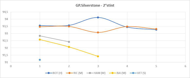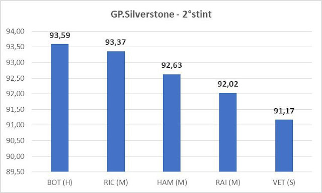 Nel secondo stint, meno indicativo perché troppo breve, sorprende il tempo di attacco di Vettel che è stato l’unico a girare su 31 basso sfruttando la mescola Soft e qualche kg in meno di benzina visto che il suo primo stint è stato il più lungo dei Top Driver.