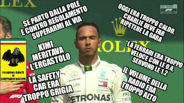 Hamilton e il dopo gara. Voto: pessimo. Luigino non è abituato a perdere da molto tempo. Nelle ultime gare è sembrato tornare l’Hamilton fragile e insicuro di cui tanti parlano (e in qui qualcun altro spera). Adombrare addirittura strategie specifiche per danneggiarlo è oltraggioso (cito Turrini). Ti allontani come un bambino capriccioso, non accetti le scuse di un galantuomo come Raikkonen, fra i più corretti del Circus, non vai alle interviste…Capisco la rabbia, la trance agonistica, la delusione, tutto quello che volete…anche perché nessuno è perfetto…però queste uscite non sono degne del suo talento assoluto.