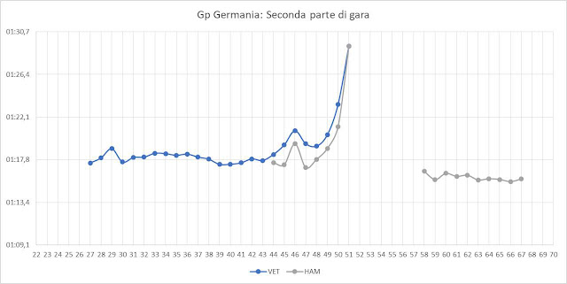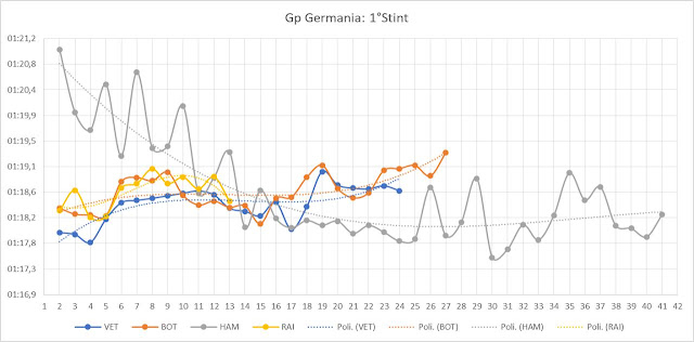 Hamilton dopo una partenza molto tranquilla, per evitare qualsiasi tipo di problema, ha iniziato giro dopo giro a recuperare posizioni e già al giro 14 si trovava in posizione 5 con un distacco da Vettel di circa 25 s. Dal giro 16 fino Hamilton che si trovava a pista completamente libera ha iniziato a guadagnare sui piloti di testa come potete facilmente osservare dal grafico in basso. Le gomme soft sulla Mercedes W09 hanno funzionato alla grande con tempi molto costanti tanto da permettere al pilota inglese di "pittare" al giro 42. Se osserviamo la linea di tendenza il momento più opportuno per effettuare la sosta era al giro 30 ma in casa Mercedes hanno preferito allungarlo per un duplice motivo: riuscire a mettere le UltraSoft nell'ultima parte di corsa e capire l'andamento del meteo visto che si attendeva dell'acqua caduta poi solo in certe zone della pista ma non a sufficienza da obbligare l'utilizzo degli pneumatici intermedi.