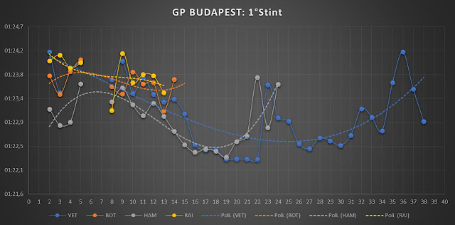 Le scelte fatte dalla Ferrari non hanno dato i risultati sperati con Raikkonen perchè il pilota finlandese non ha trovato un buono spunto in partenza, non riuscendo di conseguenza a scavalcare i due Mercedes. Anzi, si è trovato a lasciar strada al compagno di squadra in curva 3. Nel primo stint si poteva pensare ad un crollo repentino delle prestazioni sulla Mercedes di Hamilton ed invece importanti modifiche di setup scelte dal pilota inglese con il suo Team gli hanno permesso di correre una prima parte di gara impressionante, con ben 60°C di pista. Oltre ai positivi cambiamenti di setup, la buona gestione degli pneumatici è stata possibile anche dall'essere in testa e correre di conseguenza in aria libera. Gestione che, analizzando il grafico, è stata ottimale per Hamilton così come la scelta del pit stop che è stata effettuata, come si vede dalla linea di tendenza, nel momento in cui le gomme stavano per avere un crollo importante. Il momento ideale sarebbe stato il giro 21 ma, avendo un gran distacco nei confronti di Vettel, Mercedes ha preferito allungare lo stint per non correre nessun rischio nella durata del compound Soft che ovviamente doveva essere portato alla fine della corsa.