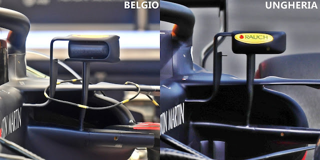Perchè parliamo di specchietti macroscopicamente simili a quelli Ferrari ma nelle funzioni invece molto diversi? Perchè a tutti gli effetti ora gli specchietti retrovisori della RB14 sono "ventilati", e le foto FUnoAT in questo articolo sono molto chiare da questo punto di vista, ma lo scopo principale non è quello di ridurre la resistenza all'avanzamento bensì quello di guidare in modo migliore il flusso diretto verso il posteriore della vettura (hp: con la vecchia specifica di specchietti il flusso "separava"?).