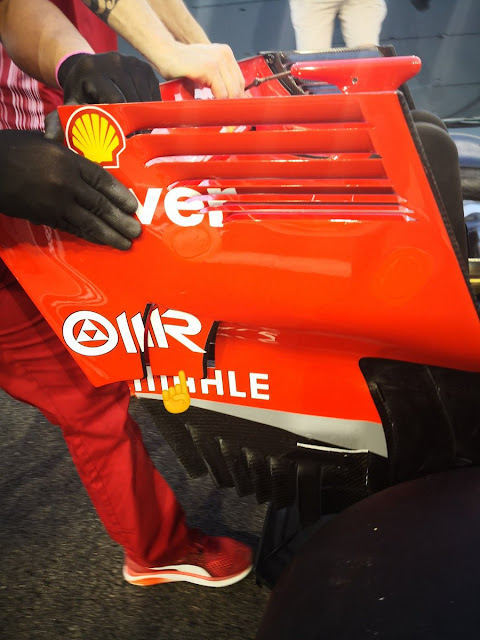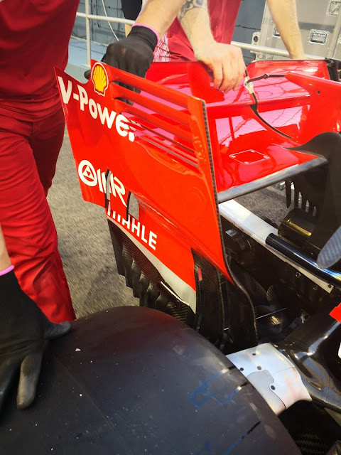 Come potete osservare dall'immagine dell'amico Albert Fabrega, rispetto alla versione utilizzata in Ungheria, nella parte bassa gli endplate presentano due vistose soffiature. E' stato creato un vero e proprio foro che permette all'aria di entrare al di sotto dell'alettone posteriore per cercare di aumentare la differenza di pressione tra il dorso ed il ventre dell'ala in modo da aumentare il carico aerodinamico generato.