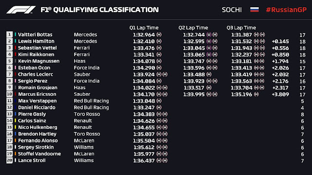 Bottas, su una pista su cui è sempre stato veloce, è riuscito a battere Hamilton portando la sua W09 in pole position. Hamilton, fino al Q3, sembrava poter ottenere piuttosto agevolmente la prima posizione ma in Q3 ha commesso degli errori in entrambi i tentativi "regalando" il miglior tempo ad un ottimo Bottas.