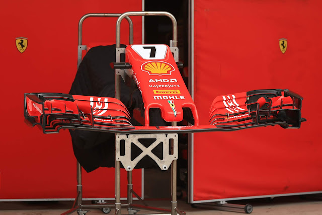 Ritornando al fondo introdotto in questo weekend di Austin, possiamo notare come siamo stati aggiunti tantissimi generatori di vortice/deviatori di flusso che hanno la funzione di energizzare ulteriormente il flusso in una zona nevralgica della monoposto. Con questa soluzione, che risulta a tutti gli effetti inedita, gli aerodinamici di Maranello si attendono un sostanziale incremento di carico aerodinamico generato al retrotreno, bilanciato all'avantreno grazie all'utilizzo dell'ultima versione di ala anteriore, da maggior carico rispetto a quella utilizzata in precedenza, portata in pista a Sochi e che si è rivista sia in Giappone che nei box di Austin.