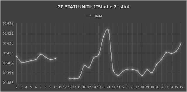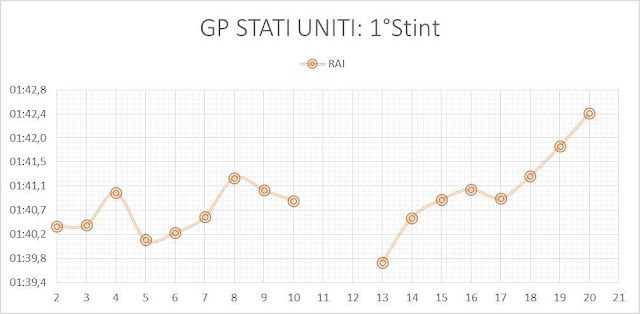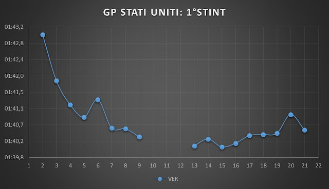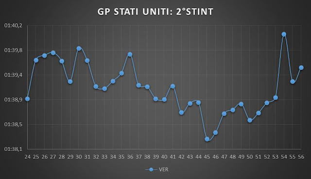 Le gomme SuperSoft montate nella seconda parte di gara hanno dato dei risultati veramente sensazionali sia a livello di grip che di durata tanto che Verstappen, pur con pneumatici con molto chilometri è riuscito a tenere alle sue spalle Hamilton piuttosto agevolmente pur con pneumatici Soft molto più freschi. Come dimostra il grafico in basso c’è stato un innalzamento dei tempi negli ultimi giri ma senza nessun tipo di “cliff” e questo è da imputare anche all'abilità di guida di Verstappen che è riuscito a gestire gli pneumatici in modo fantastico portando a casa un insperato secondo posto a ridosso del vincitore Raikkonen.