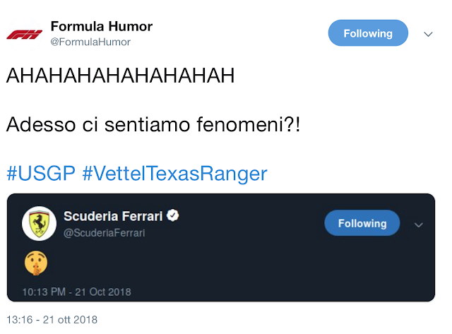 La scuderia Ferrari e la comunicazione sui social. Voto: non trovo le parole. Appena finita la gara è uscito questo Tweet che riportiamo con il sacrosanto commento di Formula Humor. Che dire? Quanta arroganza!