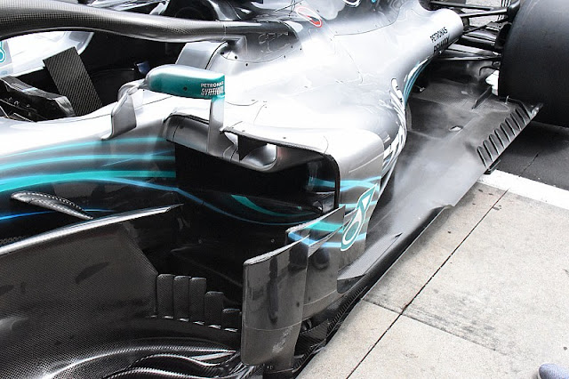 Visto l'ala anteriore semplificata, Mercedes sta lavorando molto su importanti sviluppi nella zona delle "zanne" che sono state introdotte nell'ormai lontano Gp di Spagna del 2017 al posto dei canonici turning vanes.