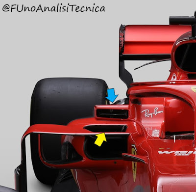 Con il passare degli anni anche dei componenti poco importanti come gli specchietti retrovisori hanno assunto delle forme caratteristiche sempre più aerodinamiche per evitare che la loro turbolenza influenzi gli elementi a valle. Ciò vale sicuramente anche per i supporti degli specchietti stessi che, come abbiamo potuto vedere sulla SF71H, fungevano da veri e propri deviatori di flusso. Ma la Ferrari, sulla ottima vettura che ha corso la scorsa stagione, aveva fatto un ulteriore passo in avanti rendendo dei dispositivi aerodinamici anche le parti interne degli specchietti stessi. Come si può ben vedere dall'immagine FUnoAT, erano state create delle canalizzazioni per far scorrere l'aria in arrivo dall'avantreno.