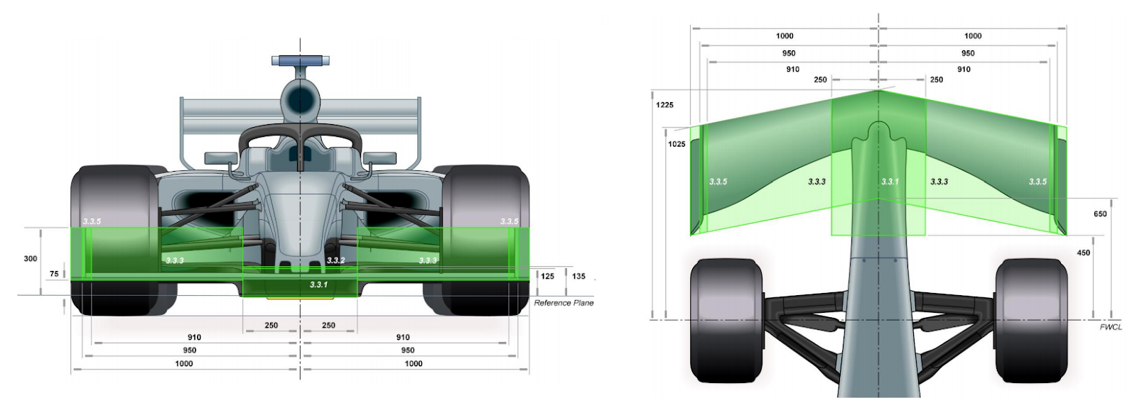 La FIA ha altresì deciso di cambiare le misure delle ali, per cercare di recuperare parte della spinta verticale (downforce) persa con queste modifiche. Nella pratica tutto ciò si traduce con l’incremento in ampiezza dell’ala anteriore di 200 mm, raggiungendo di fatto l’ingombro orizzontale della vettura. Per di più la profondità amplia la sua misura in direzione anteriore di 25 mm, cosi come l’estensione in altezza aumenta dello stesso valore.